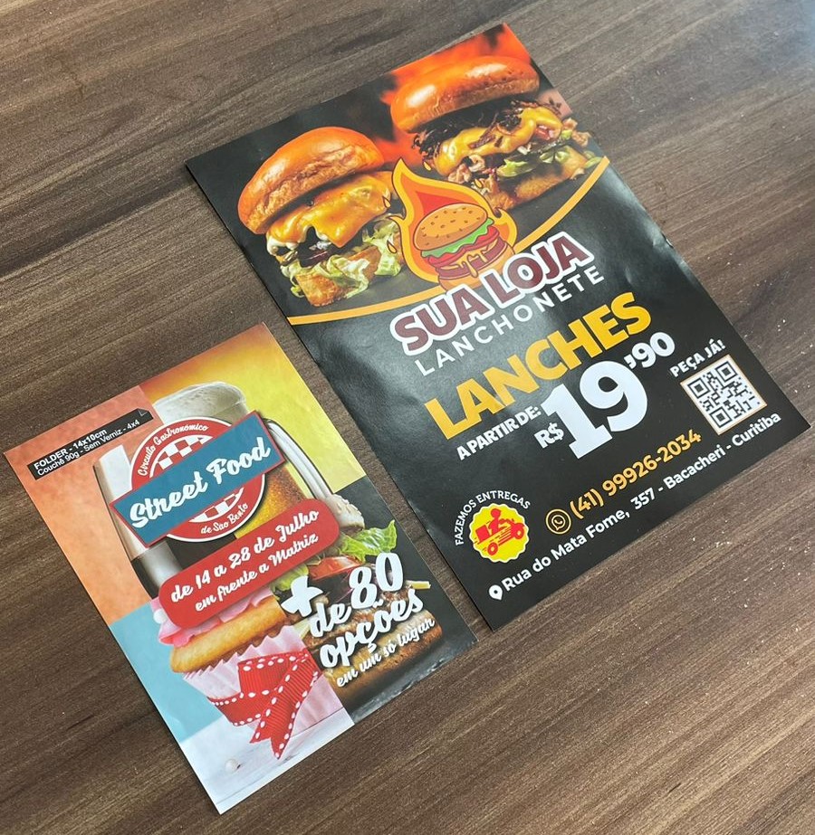 Papel Couchê 90g: A gramatura de entrada, o material mais vendido para panfleto e também o mais comum entre as divulgações. Comum em todos os tipos de comércio, seja um simples de rua ou até clínicas e outros serviços com valor agregado maior.